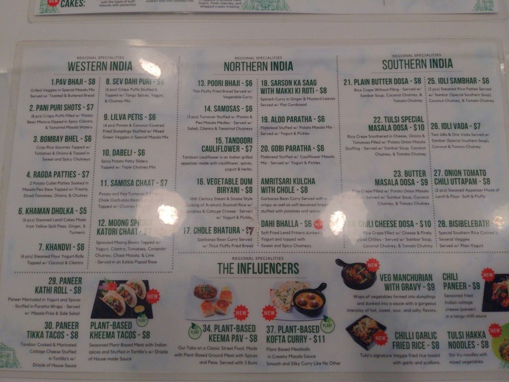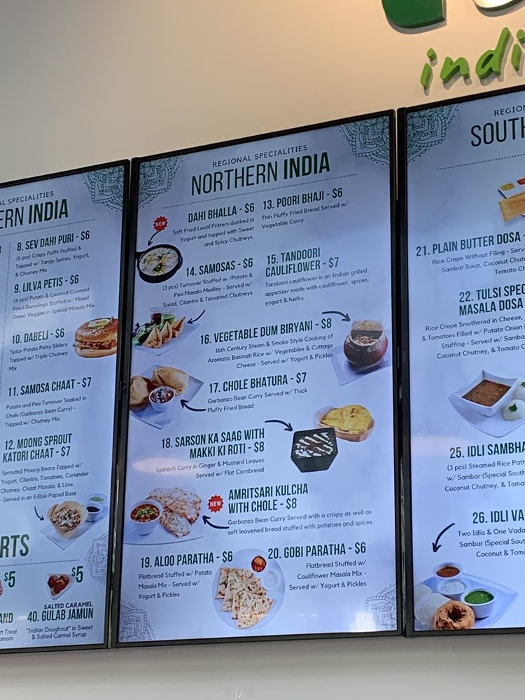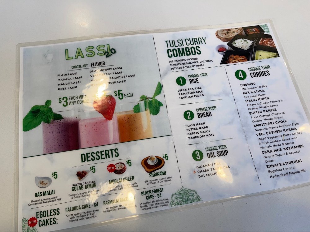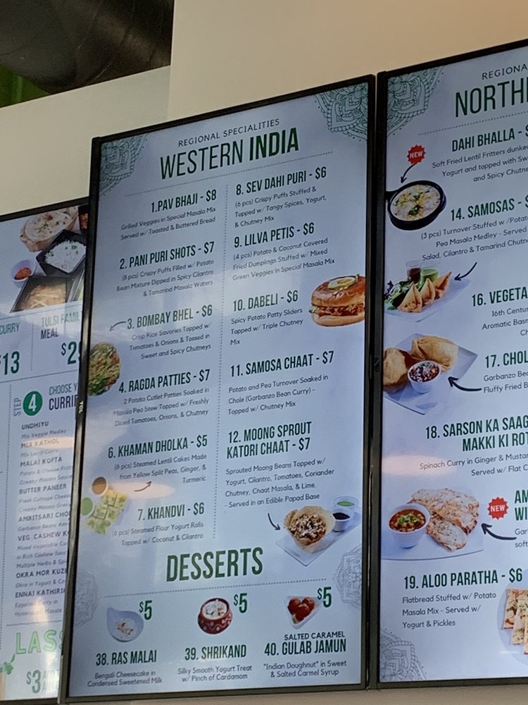 Introducing the menu at Tulsi Indian Eatery - DTLA, where you can indulge in a variety of flavorful dishes. From their popular Two and Three Curry Combos to the tantalizing Street Bites like Pani Puri Shots and Vada Pav, there is something for everyone to enjoy. Regional Entrees like Chole Bhature and Paneer Tikka Tacos showcase the rich and diverse flavors of Indian cuisine. Customers rave about the exquisite appetizer menu, showcasing the restaurant's dedication to providing a wide range of options. The modern and expansive space, along with attentive and caring staff, create a welcoming dining experience. While some minor issues with ordering have been noted, the overall quality of the food shines through, making Tulsi Indian Eatery a must-visit for authentic Indian cuisine in DTLA.